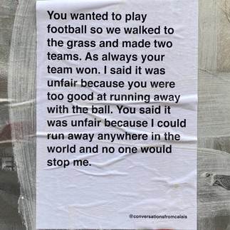 Conversations From Calais is a project that documents conversations between volunteers and migrants in Calais and pastes them on the walls of our cities. It is a way of re-humanising the refugee crisis. We have now shared more than 260 conversations volunteers have submitted. These have been typed out in 12 different languages, printed as posters and pasted up on walls in 60 cities and five continents. This ever-growing collection of conversations focuses on capturing the diversity of experiences and moving away from categorising refugees as villains, heroic figures or hopeless victims.